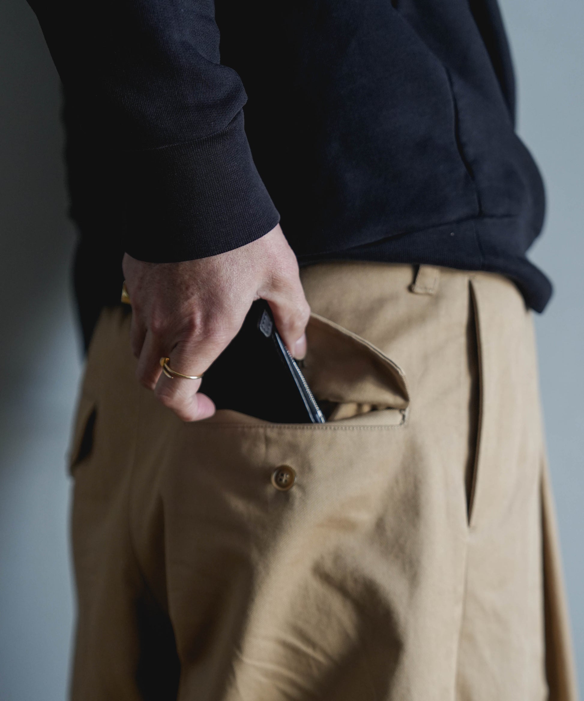 メイン素材には、フランスの名門・アノネイ社の「ラスティカーフ」を採用。天然シボが織りなす柔らかな表情と、手に吸い付くようなしなやかさ、そして芯のあるコシ感を併せ持つ最高級のレザーです。裏面に至るまで贅沢に同素材を使用した、一切の妥協のない仕上がりとなっています。